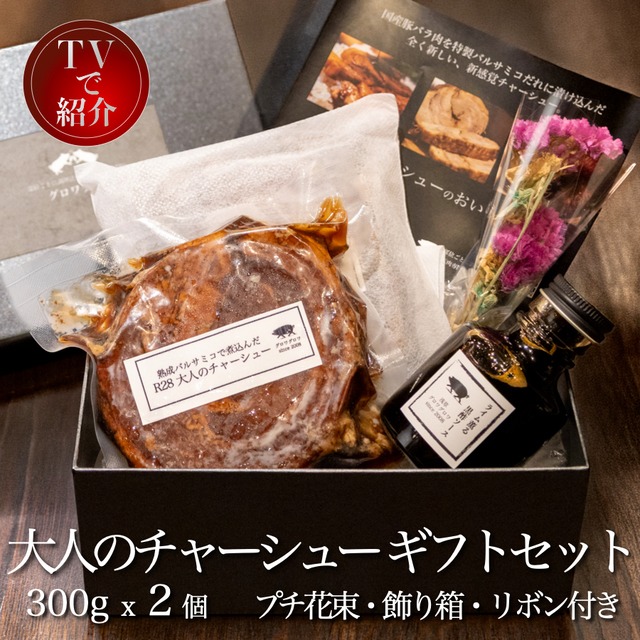 「大人のチャーシュー ギフトセット」 贈るために磨かれた、究極のチャーシュー。 普通のチャーシューではない、「大人のごちそう」。 「豚肉をごちそうに」 熟成バルサミコの甘酸っぱい余韻。 ワインにも合う味わいを、特別なギフトとしてお届けします。 ■ なぜ特別なのか 塩や醤油ベースではなく、 熟成バルサミコの酸味と甘みを軸に、 ほのかにスパイスを効かせてじっくり煮込みました。 和・洋・中のどこにも属さない味わいで、 ご飯にも合い、ワインにも寄り添う豚料理です。 ■ 実績と信頼 ・Yahooショッピング チャーシューカテゴリー1位獲得 ・TV・各種メディア紹介 ・富士宮市ふるさと納税返礼品 ・豚肉専門レストラン シェフ歴約20年の料理人が考案 ■ セット内容 ・大人のチャーシュー 600g(300g×2パック) ・ライム香る黒酢ソース 100cc(瓶入り) ・ドライフラワーのプチブーケ ・美味しい食べ方ガイド ■ お召し上がり方 【冷製】 細かく刻んで前菜やサラダに。 バルサミコの酸味が際立ち、軽やかな味わいです。 【温製】 袋のまま湯煎で温めると、 出来立てのようなとろける柔らかさに。 丼や炒飯など、 一般的なチャーシューと同じ使い方も可能ですが、 まずはぜひメイン料理としてお楽しみください。 ■ 贈り物として安心の仕様 ・専用飾箱 ・包装・リボン付き ・ドライフラワーのプチブーケ付き ・熨斗対応可能 ・送料無料 ■ こんな方におすすめ ・定番のハムや焼豚では少し物足りない方 ・お酒が好きな方への贈り物に ・小さなお店のこだわりが詰まった商品を探している方 ・きちんとした価格帯のグルメギフトをお探しの方 ※本商品は、一般的な塩や醤油ベースのチャーシューとは 味の方向性が大きく異なります。 あらかじめご了承のうえお選びください。 【!ご注意!】 ※こちらの商品は受注生産のため発送までに7営業日ほど頂戴する場合がございます。 ※配送日をご指定いただいた場合でも上記の理由によりご指定日にお届けできないことがございます。でき次第に順次発送致します。
